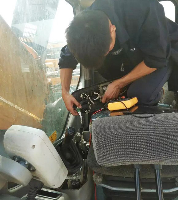 然后是难度极高的现场排故,三台挖机各被设置不同的故障(每台3个),考核人员随机抽取机器,需在30分钟内找出故障点,参赛的服务人员一个个耐心、细心的进行着,熟练的拿起工具对挖机进行全面检查,对故障进行分析,进行排故……